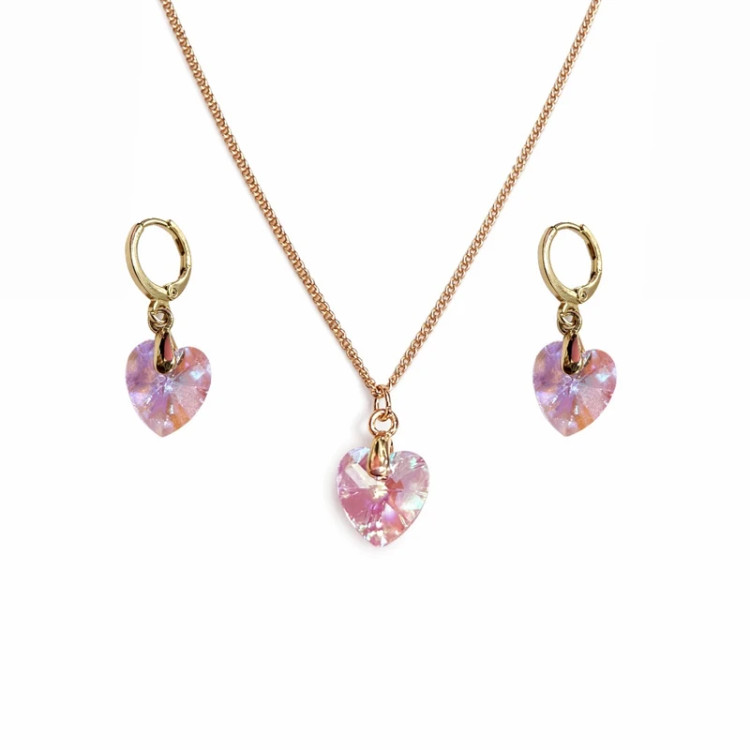 این نیمست زنانه شیک شامل گردنبند و گوشوارههای آویزدار طرح قلب است که با نگینهای کریستالی درخشان و رنگ لطیف صورتی–یاسی، جلوهای بسیار رمانتیک و خاص به استایل شما میبخشد.