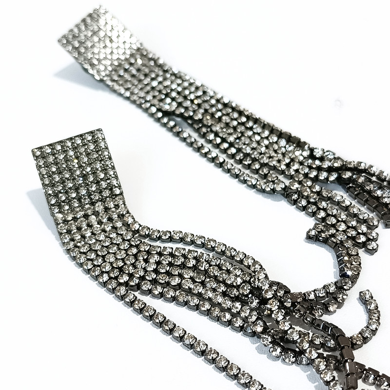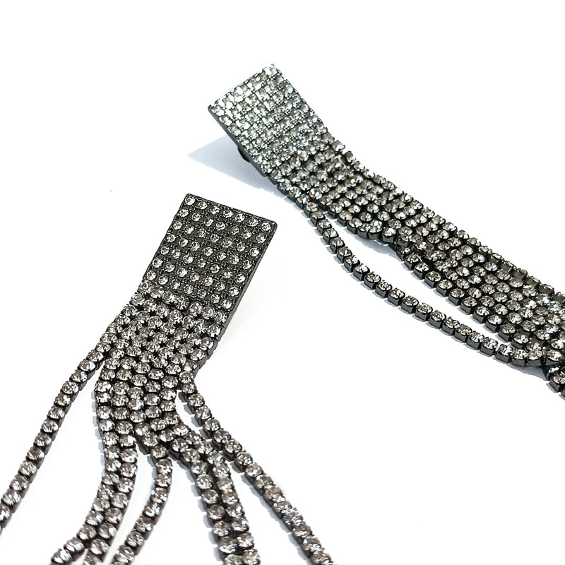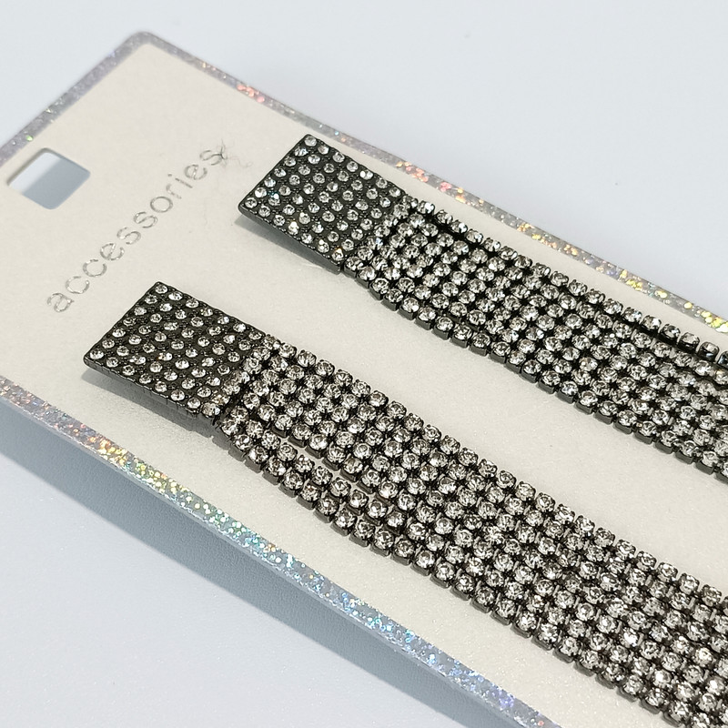 کالای فوق محصولی است از برند اروپایی accessories از برندهای زیرمجموعهی کمپانی آلمانی beeline. این گوشواره از فلز مشکی رنگ درست شده که بر روی آن نگینهای سفید رنگ درخشان قرار گرفته است. قسمت بالای گوشواره یک مربع پر از نگین با ضلع 1.5 سانتیمتر است که به آن 7 ریسهی نگینی هماندازه آویزان است و درنهایت شکل کلی گوشواره مستطیلی به ابعاد 1.5 در 10 سانتیمتر میشود. این محصول از کالکشن glamour AL است که همانطور که از نام آن پیداست، با محصولات این کالشن میتوانید در مراسمها و مجالس شب بدرخشید. نگینهای گوشواره در گوش درخشندگی وصفناپذیری داشته و بسیار مناسب برای استایل کردن با لباسهای شب ساده و تکرنگ است.
